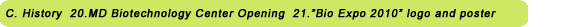 C. History 20.MD Biotechnology Center Opening 21."Bio Expo 2010" logo and poster